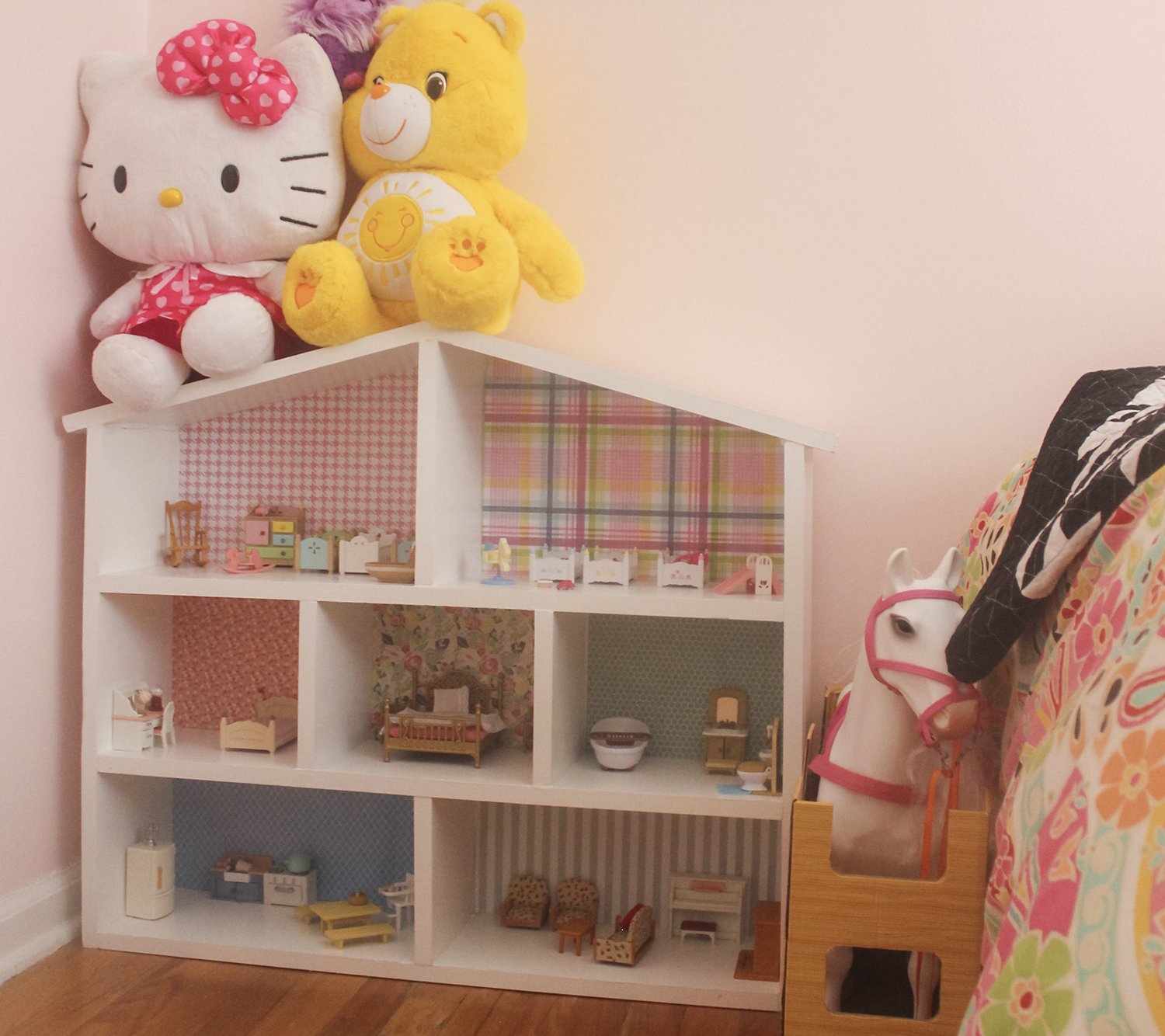 This TV stand from Ikea is the perfect height for Audrey. She can sit on the floor and easily play with all her Calico Critters. (On the TV stand, we did switch the legs out).