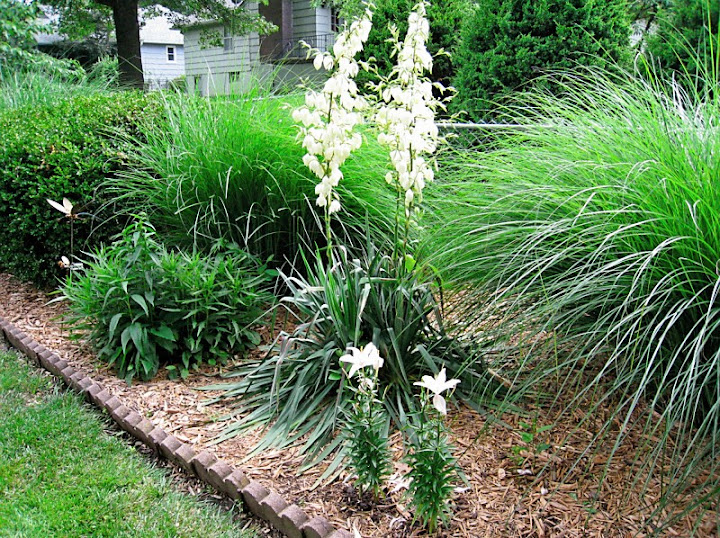 One yucca is in full bloom (my other yucca apparently decided to take the year off. But it does appear the asiatic lilies I planted to replace the zinnias are going strong – and they are big enough that the dogs run around them versus through them):